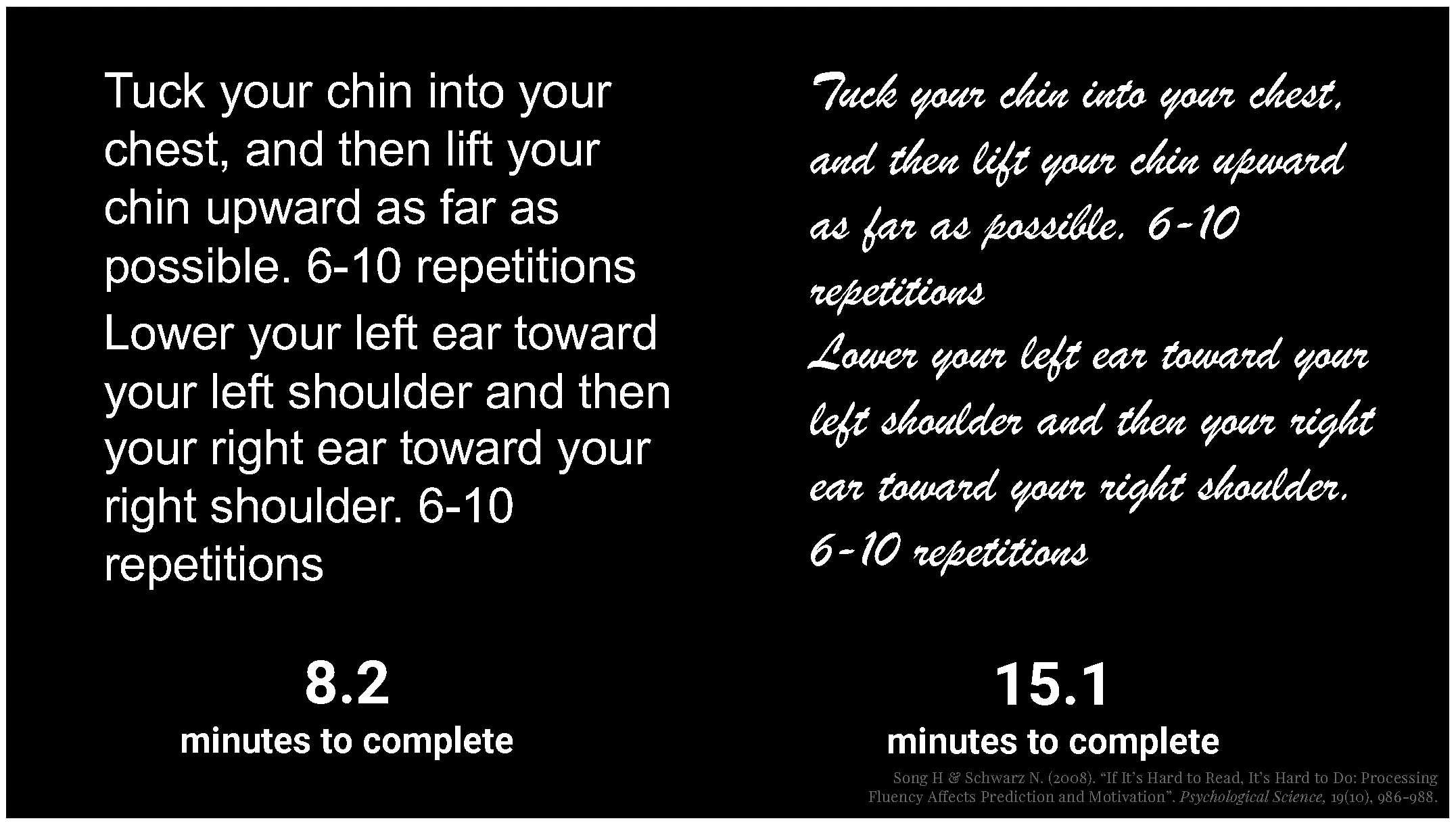 2. Song, H., & Schwarz, N. (2008). If It’s Hard to Read, It’s Hard to Do: Processing Fluency Affects Effort Prediction and Motivation. Psychological Science, 19(10), 986-988. https://doi.org/10.1111/j.1467-9280.2008.02189.x